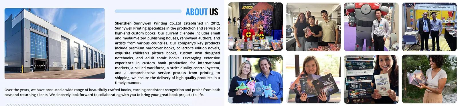 Sunywell Printing เป็นซัพพลายเออร์โรงงานหนังสือที่มีประสบการณ์ เรากำลังทำงานร่วมกับผู้จัดพิมพ์และผู้แต่งจำนวนมากที่มีบทวิจารณ์ดีๆ คุณสามารถหาเราได้ในอาลีบาบา - http://sunnywellprint.en.alibaba.com